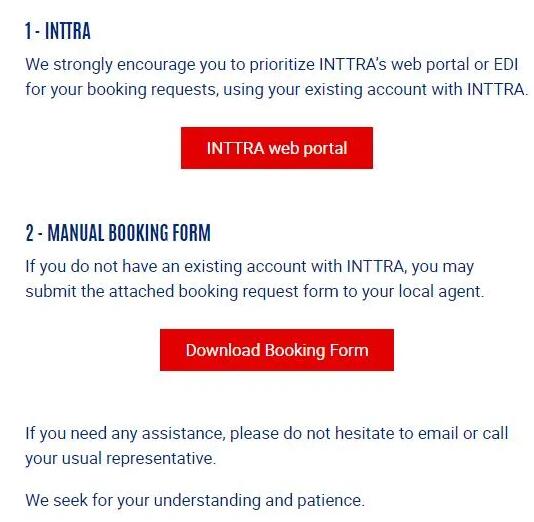 并建議客戶使用INTTRA賬戶和EDI接口進(jìn)行訂艙事宜,如若沒有INTTRA賬戶的用戶,請(qǐng)當(dāng)?shù)卮磉M(jìn)行訂艙動(dòng)作。