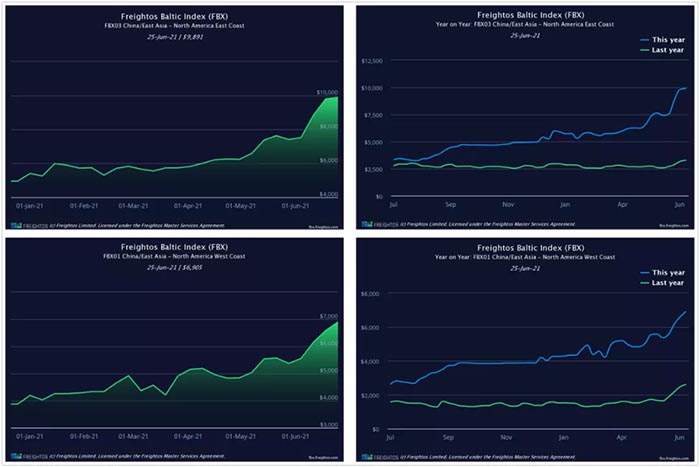 據(jù)波羅的海貨運(yùn)指數(shù)(Freightos Baltic Index)顯示,美國西海岸的FBX指數(shù)為6905美元、美國東海岸的FBX指數(shù)為9891美元。